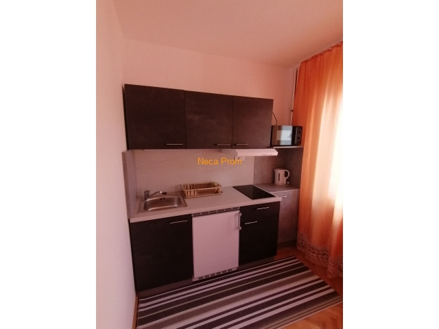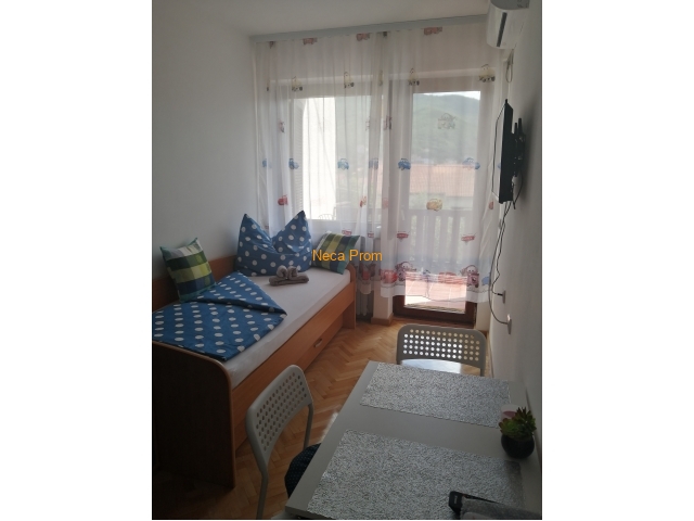 Izdaje se opremljen stan površine 43m2 u bliz1ini Akva parka, naselje Podina. Stan se nalazi na prvom spratu stambene zgrade, sastoji se od dnevnog boravka sa kuhinjom, jednom spavaćom sobom, kupatilom, terasom i obezbeđenim parking mestom. Cena mesečne kirije je 300 eura + prateći troškovi (račun za vodu, struju i održavanje zgrade).
